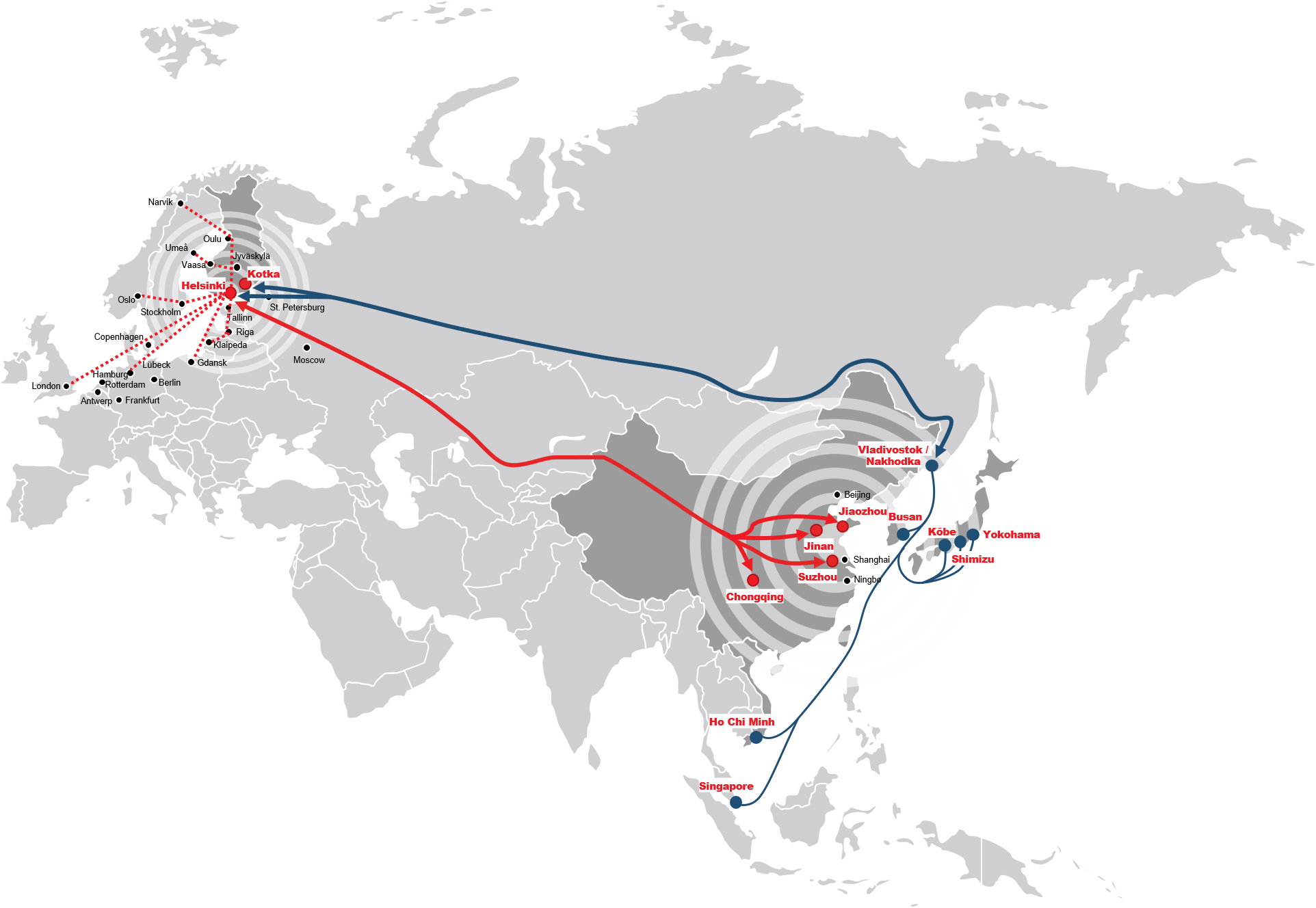 Junareitti kulkee Kotkasta Vainikkalan yli jatkaen Trans-Siberian reittiä pitkin kohti Japanin Yokohamaa. Samassa junassa menee rahtia myös Japaniin Shimizhuun sekä Singaporeen ja Etelä-Koreaan Busaniin.